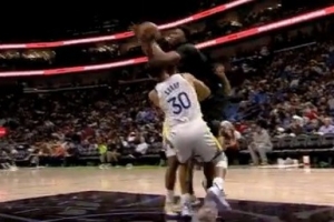 GIF-库里头上被肘到,但还是被改判防守犯规