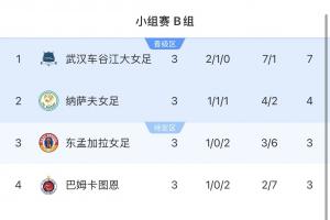 体育资讯11月23日讯 女足亚冠小组赛B组,武汉女足4-0大胜巴姆卡图恩,本场比赛后,武汉女足2胜1平积7分排名女足亚冠小组赛B组第一,强势晋级女足亚冠8强。